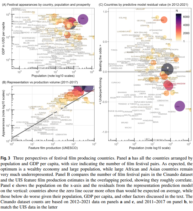 This study analyzes how economic, demographic, and geographic factors predict the representation of different countries in the global film festival circuit. It relies on the combination of several open-access databases, including festival programming information from the Cinando platform of the Cannes Film Market. The dataset consists of over 20,000 unique films from almost 600 festivals across the world over a decade, a total of more than 30,000 film festival entries. It is shown that while films from large affluent countries indeed dominate the festival screen, the bias is nevertheless not fully proportional to the large demographic and economic worldwide disparities and that several smaller countries perform better than expected. Further computational simulations demonstrate how much including films from smaller countries contributes to cultural diversity, and how countries vary in cultural “trade balance” dynamics, revealing differences between net exporters and importers of festival films. This research underscores the importance of representation in film festivals and the public value of increasing cultural diversity. The data-driven insights and quantitative approaches to festival programming and cultural event analytics should be useful for both the academic community as well as film festival organizers and policymakers aiming to foster more inclusive and diverse cultural landscapes.